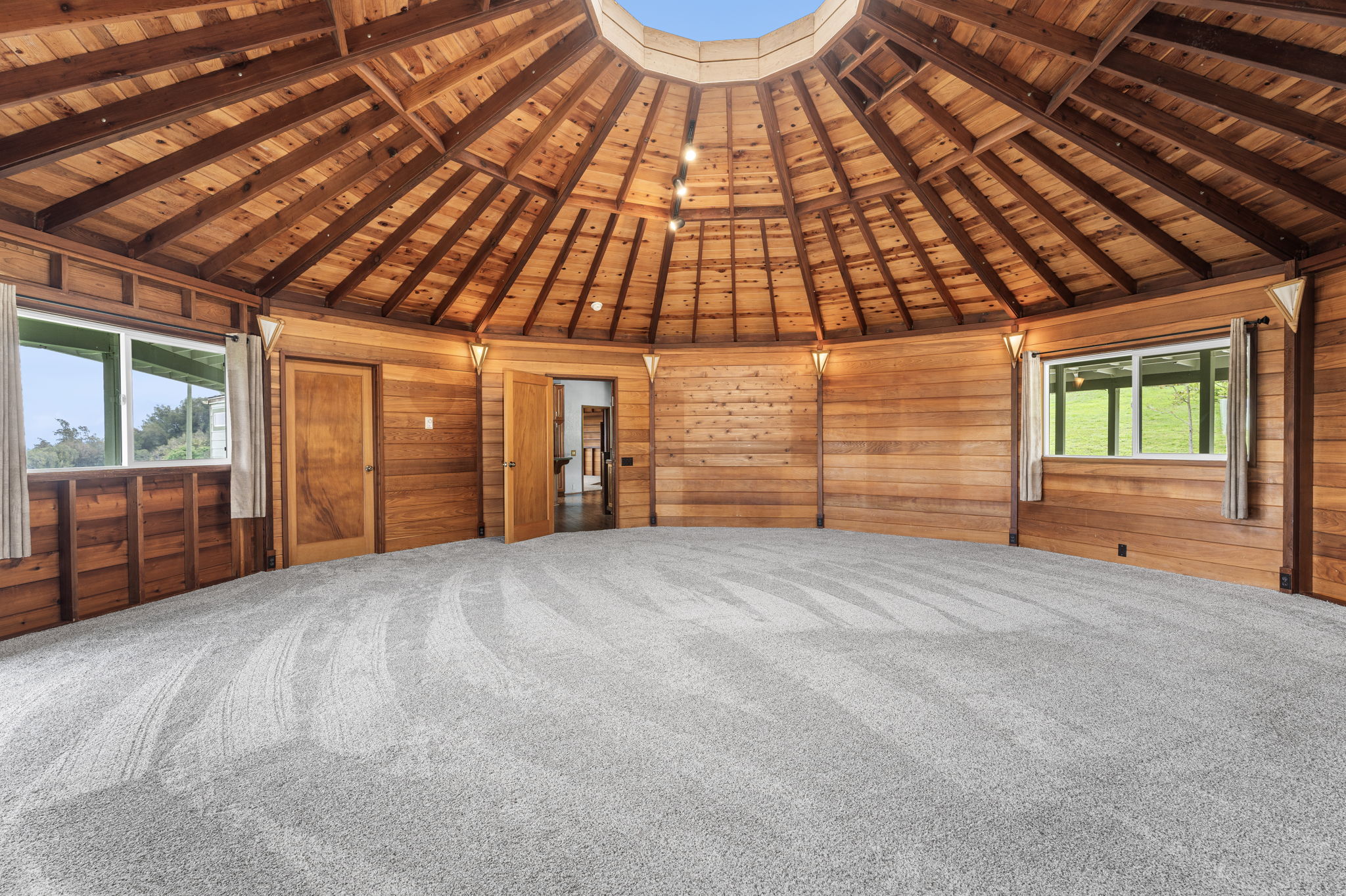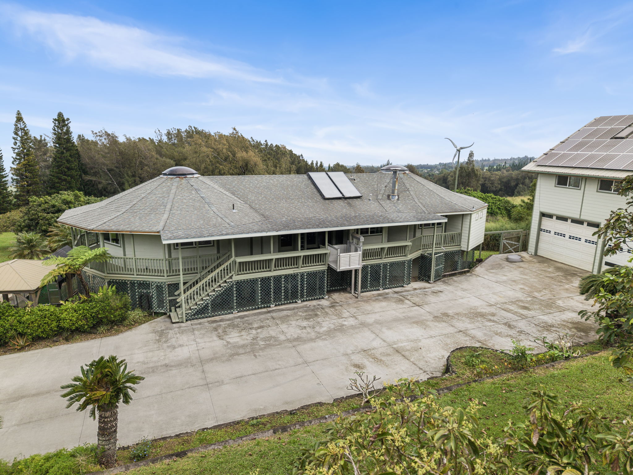 The two-story main home is architecturally striking, designed as two interlocking octagons, maximizing natural light and airflow.