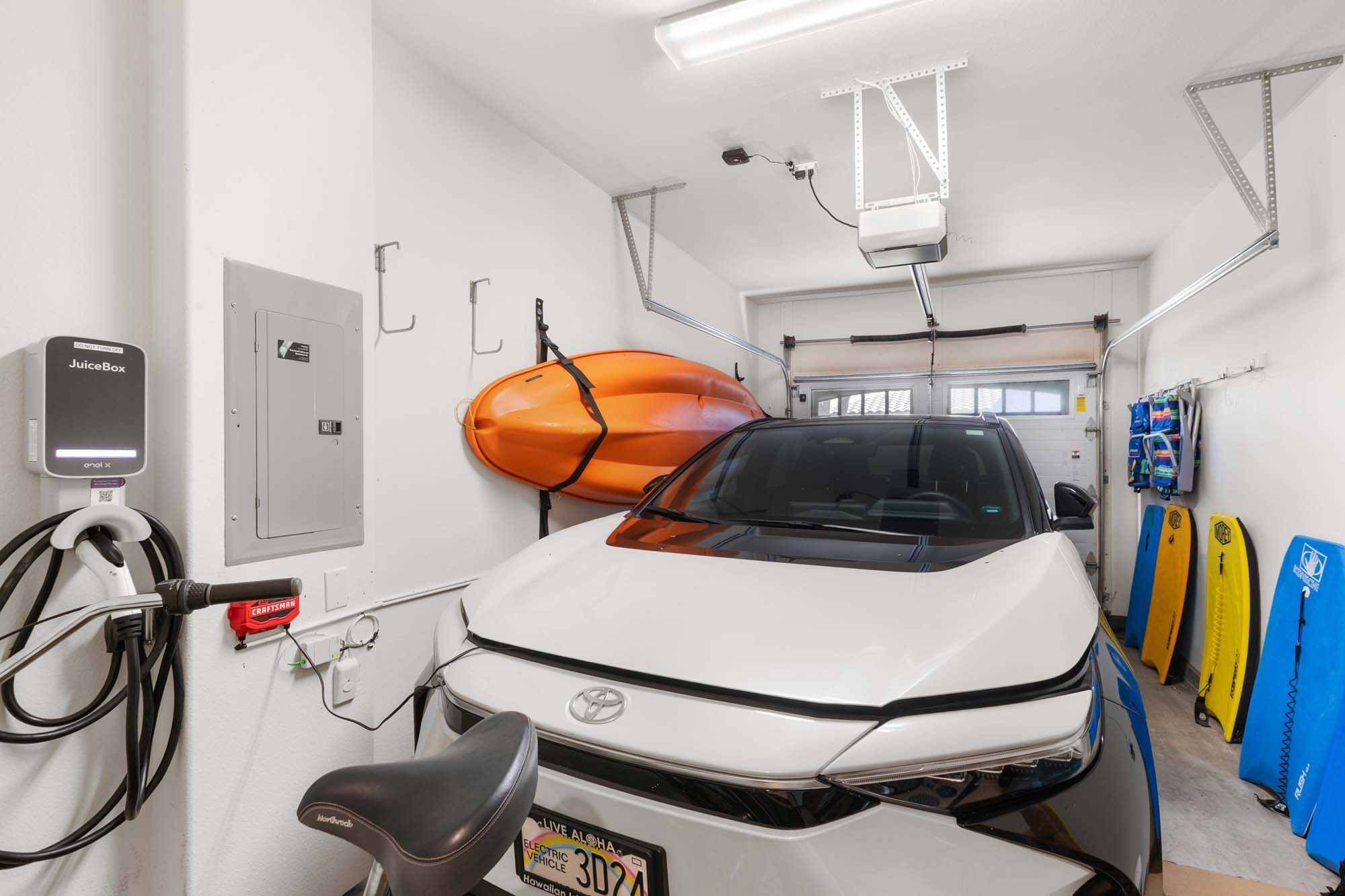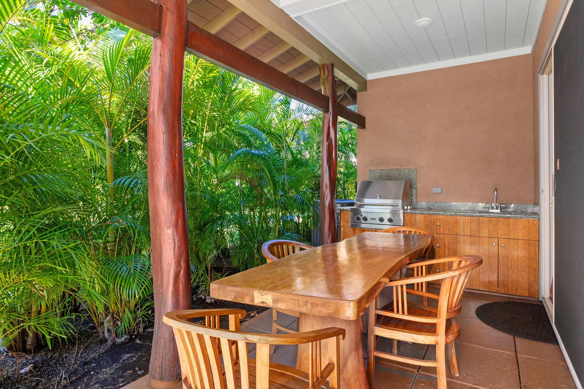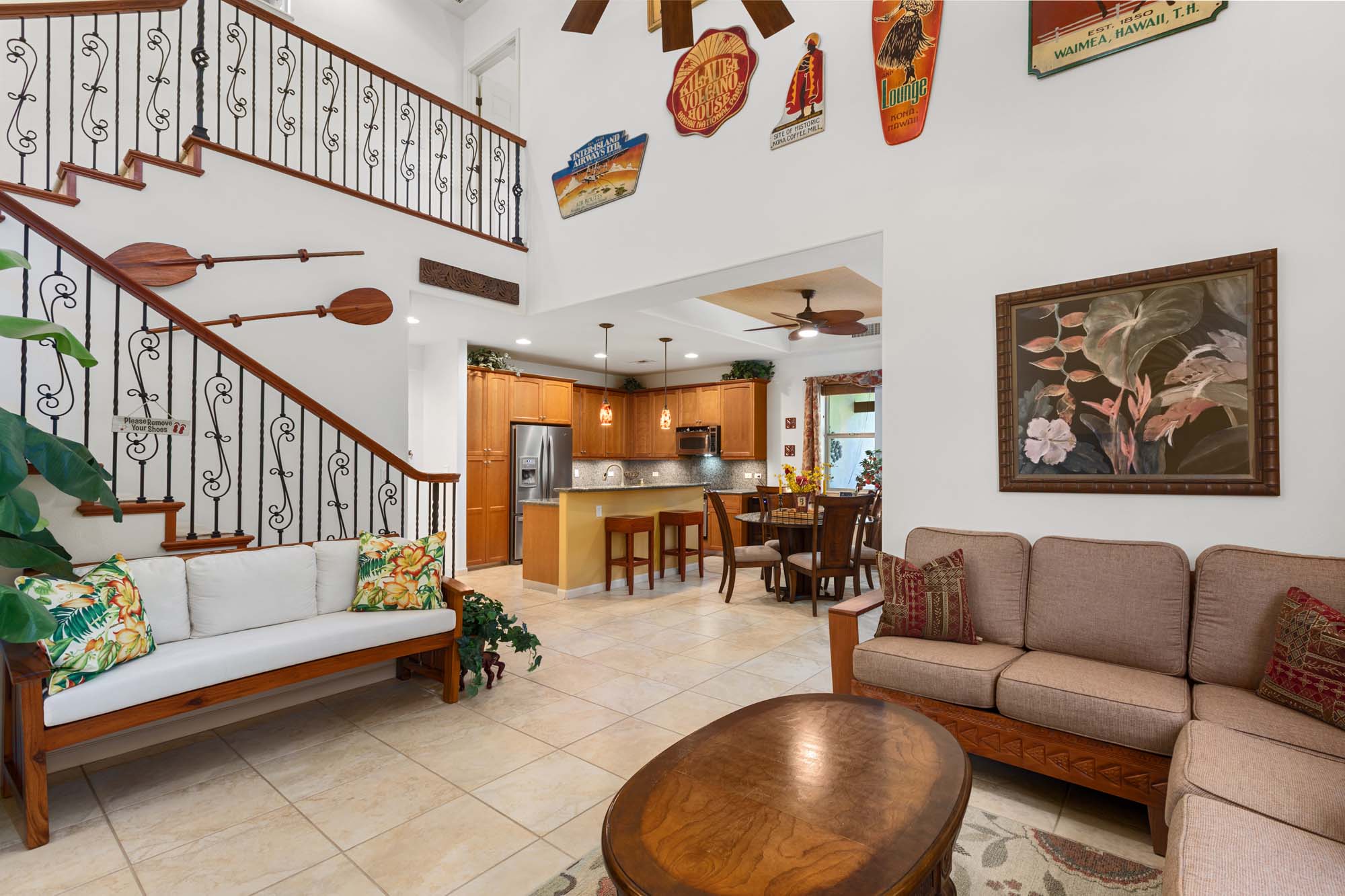 The open-concept kitchen, living, and dining areas are highlighted by soaring 18-foot cathedral ceilings and clerestory windows that bathe the space in natural light. Elegant tray ceilings adorned with Japanese grass paper add a refined touch in both the first-floor dining area and the upstairs primary suite. Step outside to the spacious 329-square-foot lānai, outfitted with a live-edge monkey pod dining table, a Viking barbecue, a wet bar, and a ceiling fan—ideal for entertaining or relaxing in comfort.