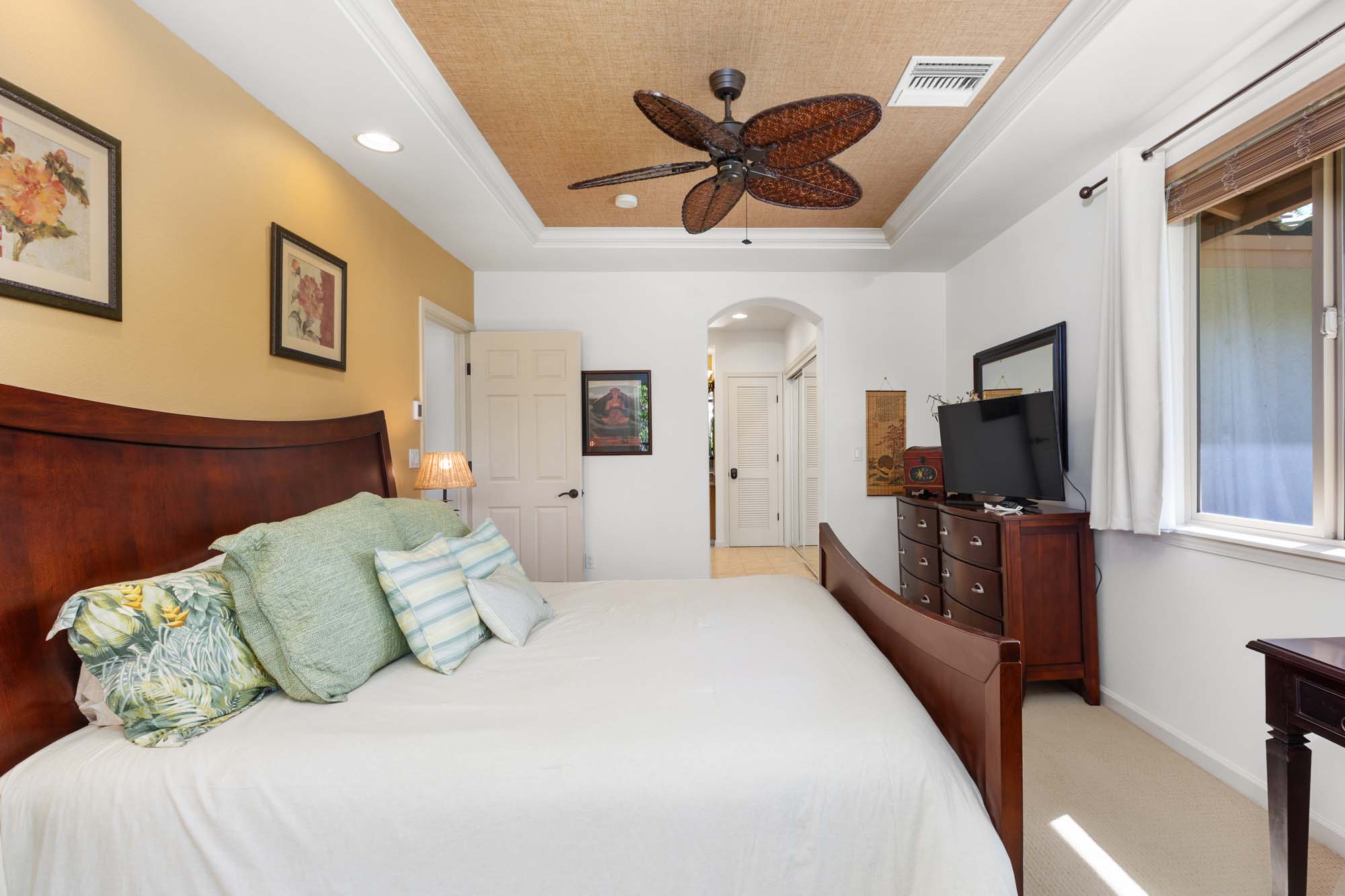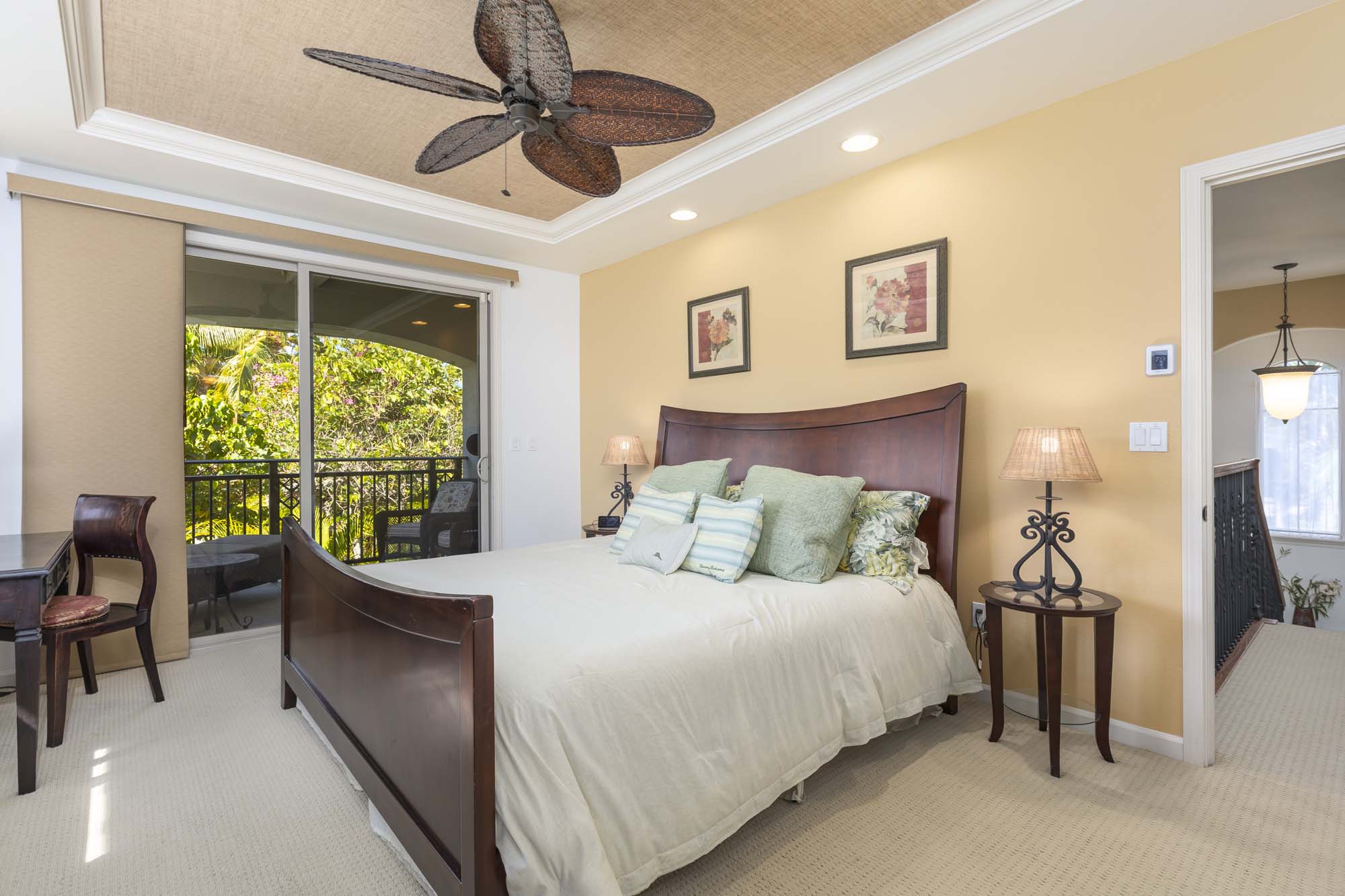 One bedroom and a full bath with a walk-in shower and granite countertops are located on the main level—perfect for guests or multigenerational living. The upper level is devoted entirely to the spacious primary ensuite, complete with a private lānai overlooking lush, park-like grounds—an inviting spot for morning coffee or stargazing. The spa-inspired bath features double sinks, a jetted soaking tub, a walk-in shower, and granite finishes. A large closet with sliding glass doors provides generous storage.