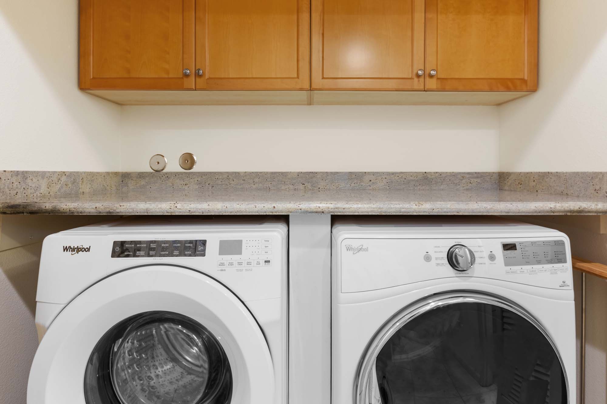 The well-equipped kitchen features stainless steel appliances, granite countertops, a breakfast bar, and ample cabinetry for all your culinary needs. Just off the kitchen, a laundry area is discreetly tucked behind closet doors and includes side-by-side washer and dryer with a granite folding shelf at the perfect height for folding or organizing.
