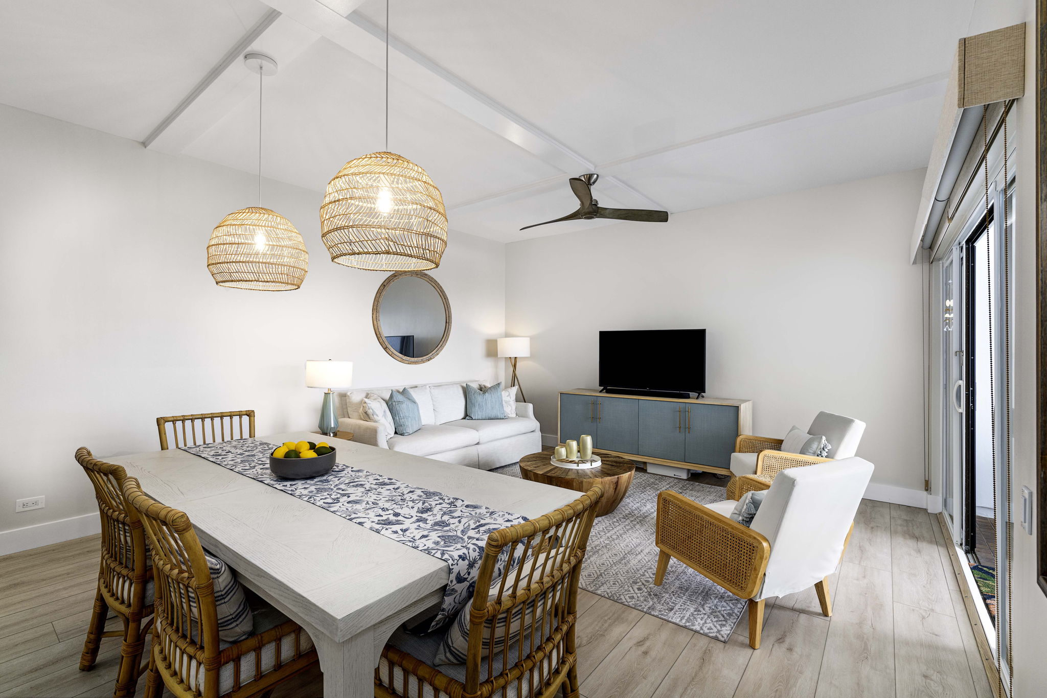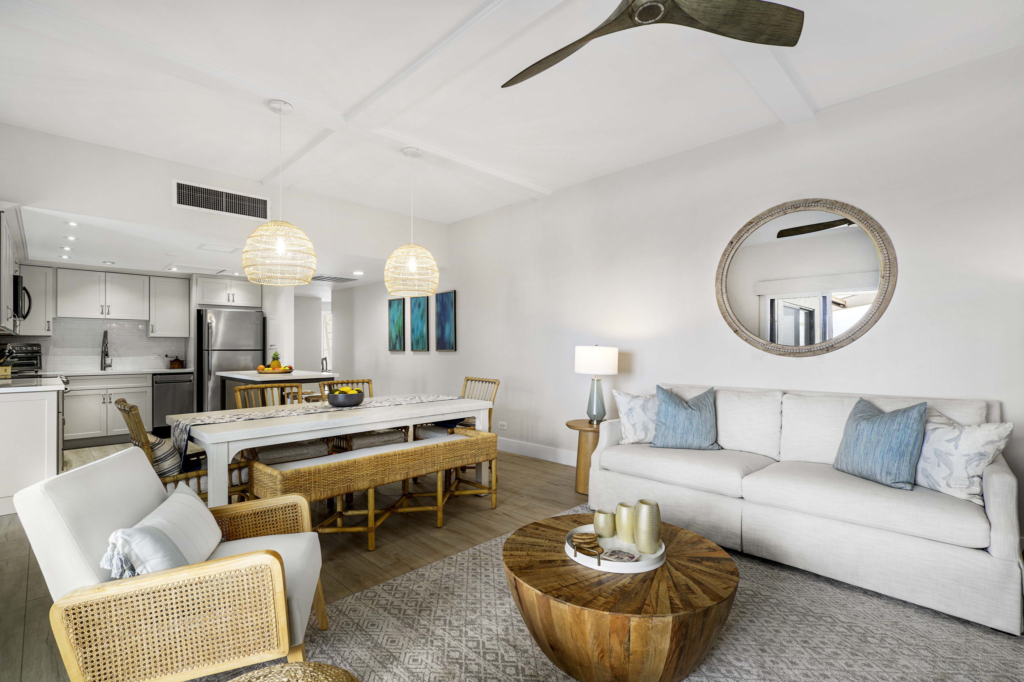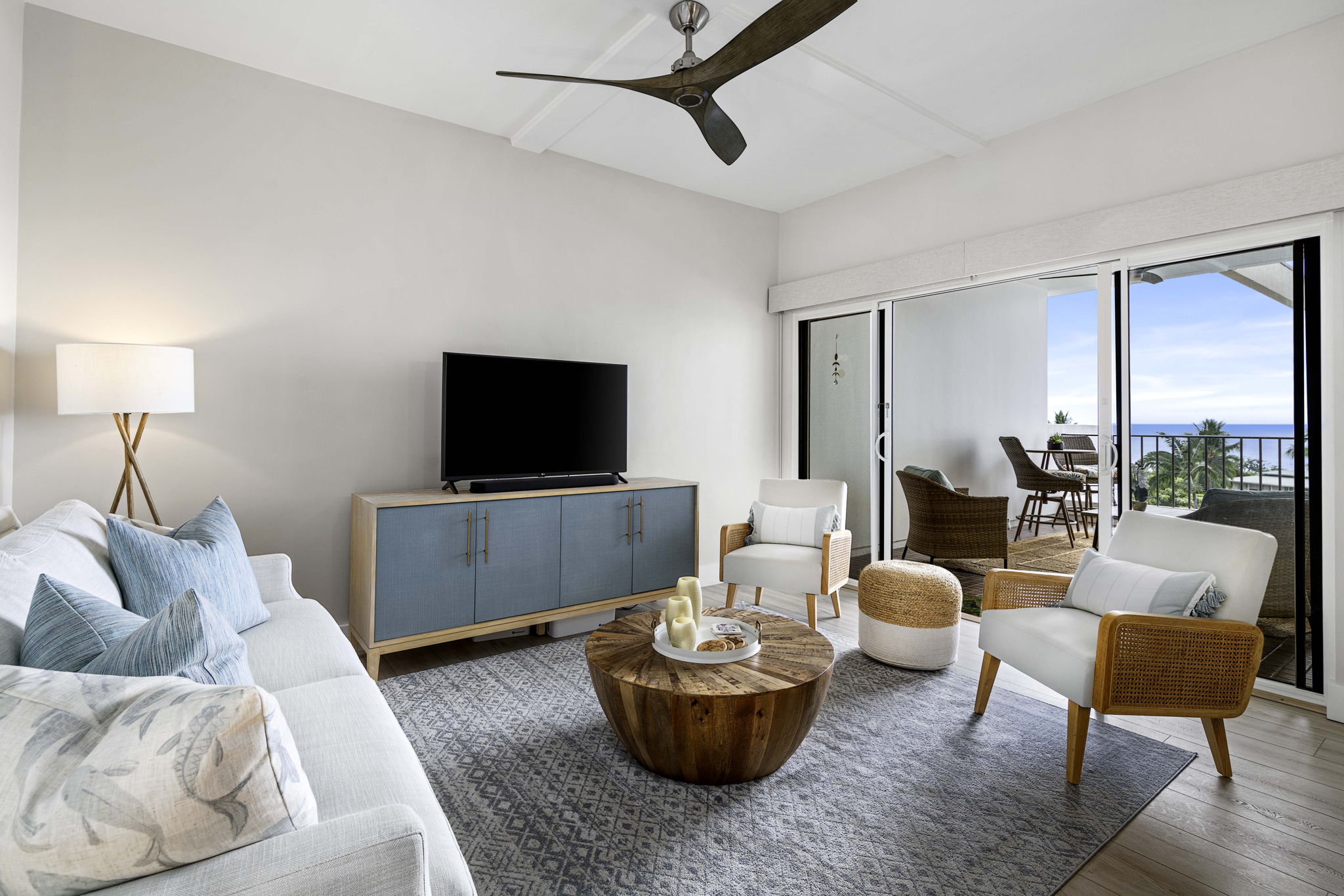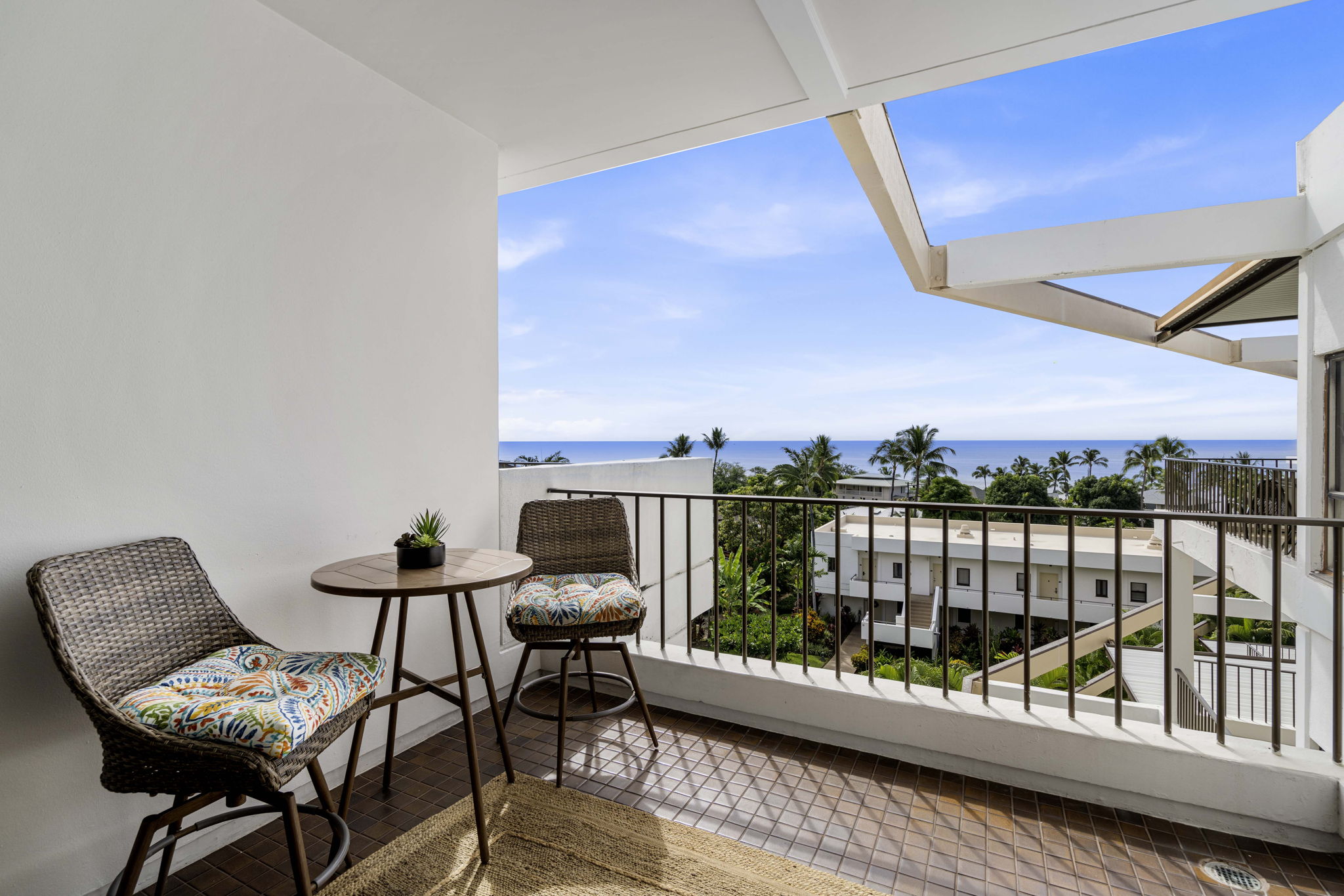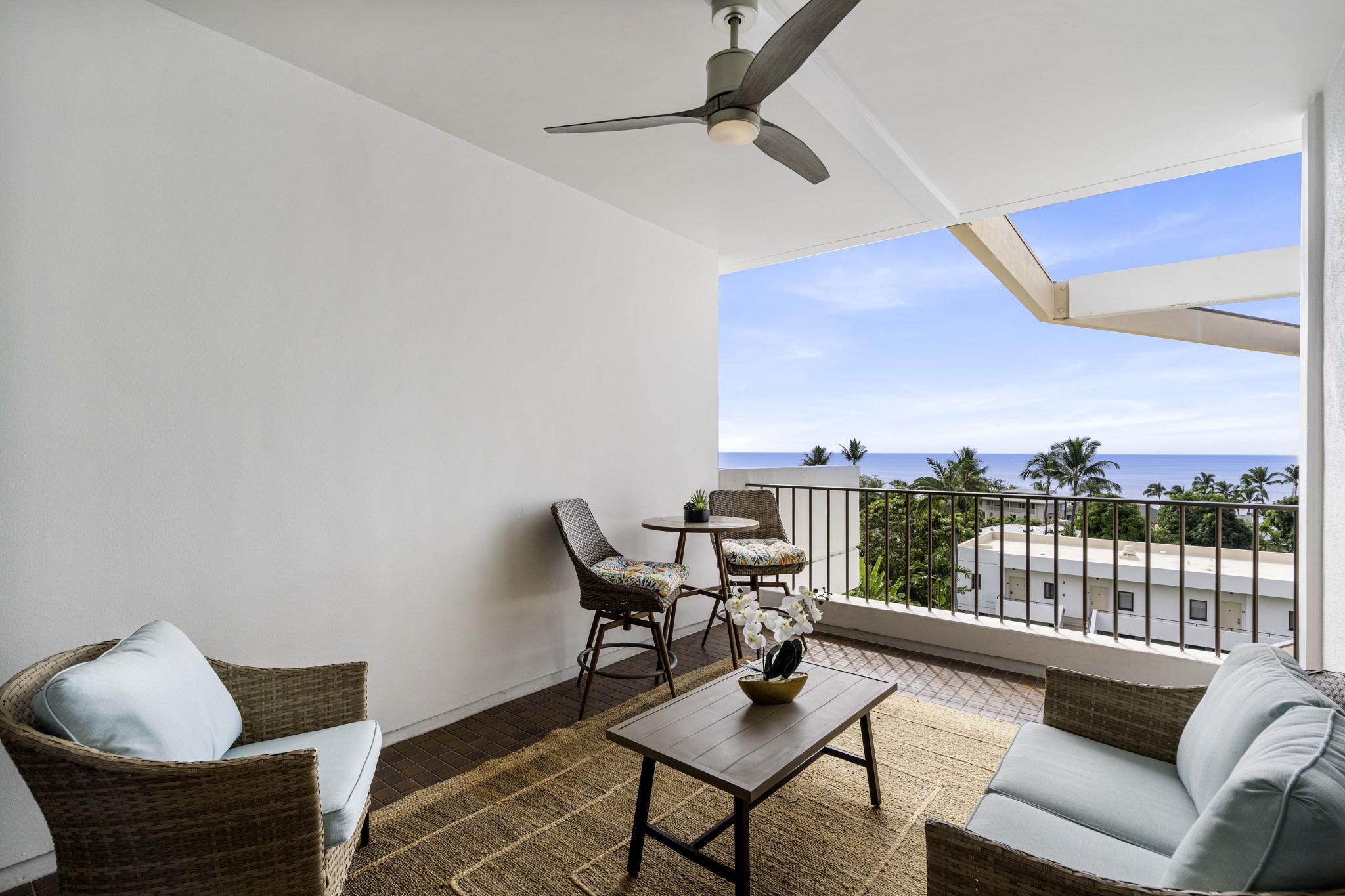 Indulge in ocean vistas from this seventh-floor penthouse unit in the Royal Sea Cliff Kona. The meticulously renovated two-bedroom, two-bath residence captures an island elegance. This designer-owned home has been remodeled from floor to ceiling, with an Organic Modern style. A palette of updated greige paint, contemporary lighting, open floor plan, and furnishings crafted from natural materials evokes a blended experience of sleekness with earthy warmth in the 1,170-square-foot interior.