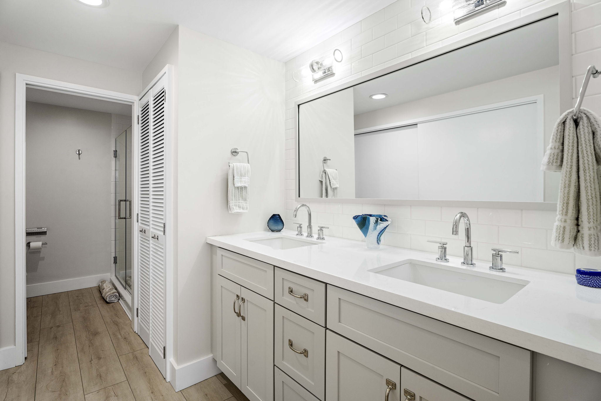 Both bedrooms offer ensuite luxury, with the primary suite presenting ocean views through sliding doors that open onto the lānai. The adjoining bath offers double closets, double sinks, new tiling, a walk-in shower, updated lighting, and a Toto toilet/bidet. The second bedroom suite, accessed through a sliding “barn” door, also features double closets with frosted glass doors and a rejuvenated bath showcasing brand new tile flooring, tub/shower, new vanity, new sink, lighting, and stylish retiling.