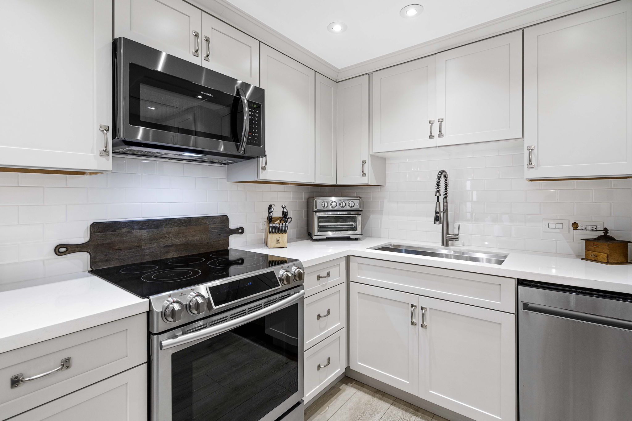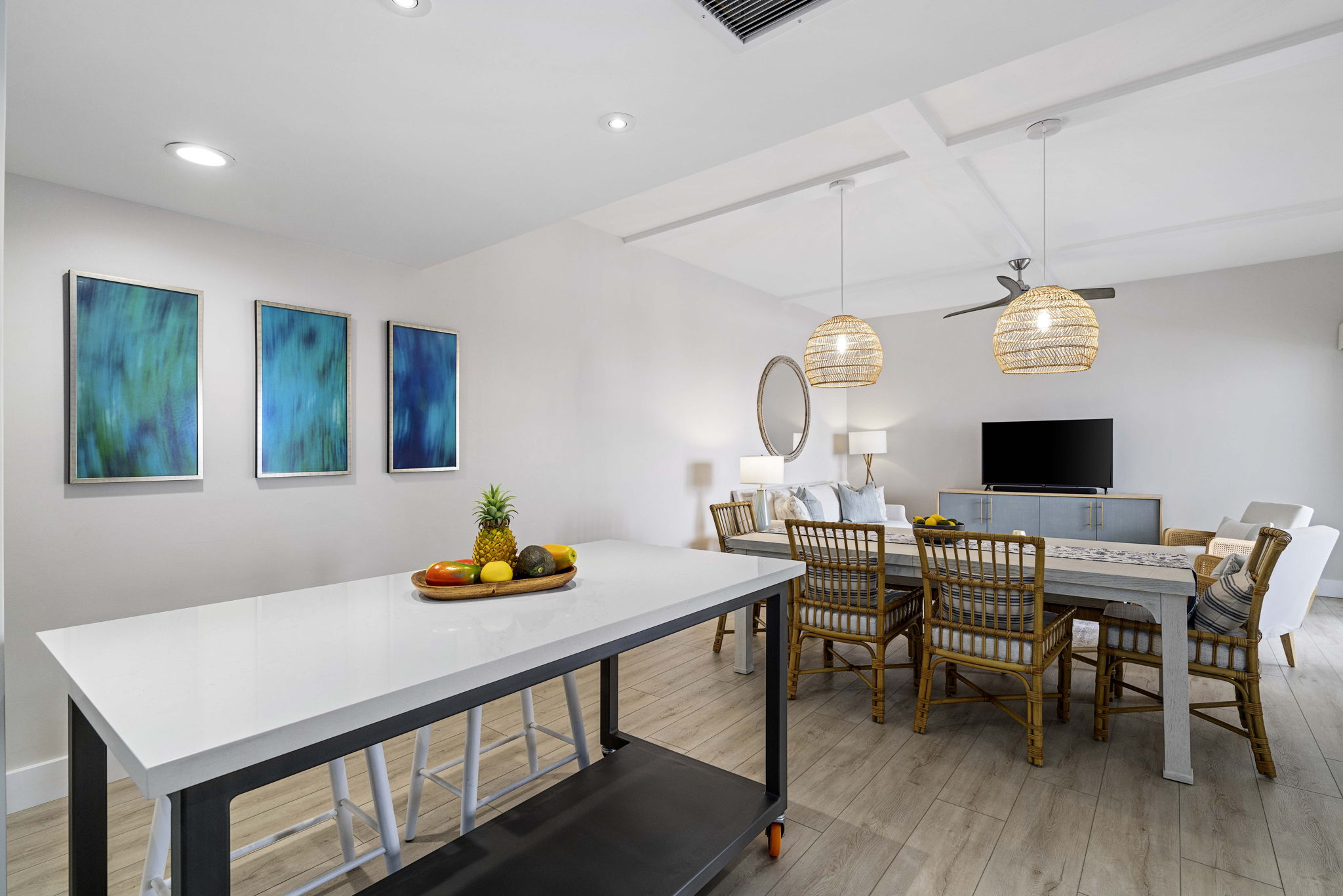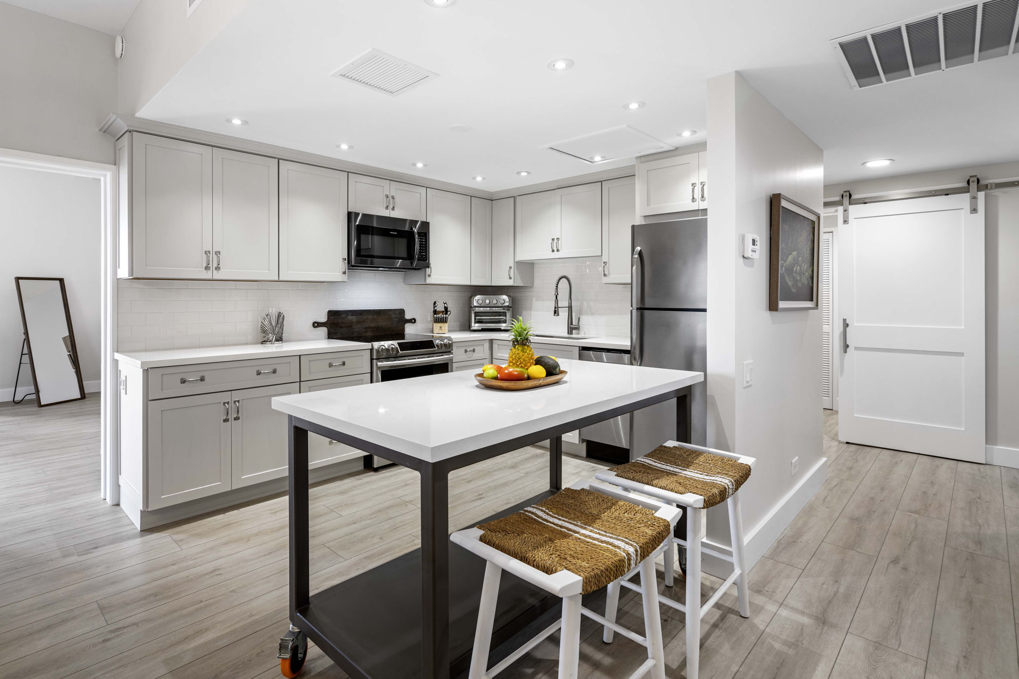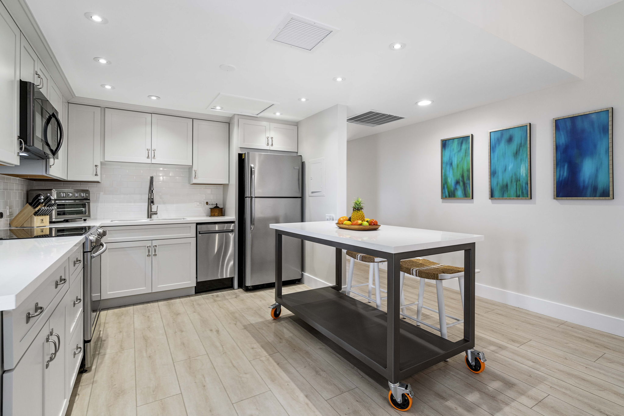 The remodeled kitchen integrates into an open floor plan with the dining and living areas and boasts a mobile, custom-made island for versatile seating and work options, new cabinets, new countertops, new appliances, and new plumbing fixtures which provides an amazing aesthetic transformation.