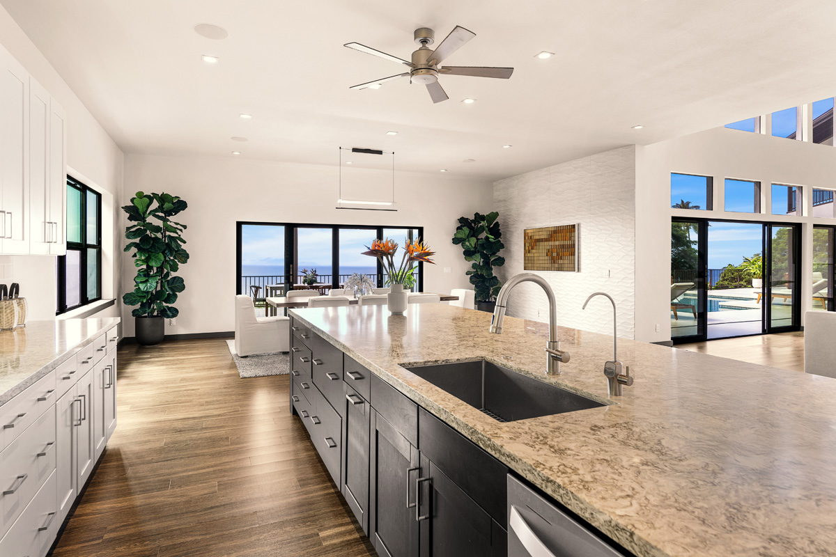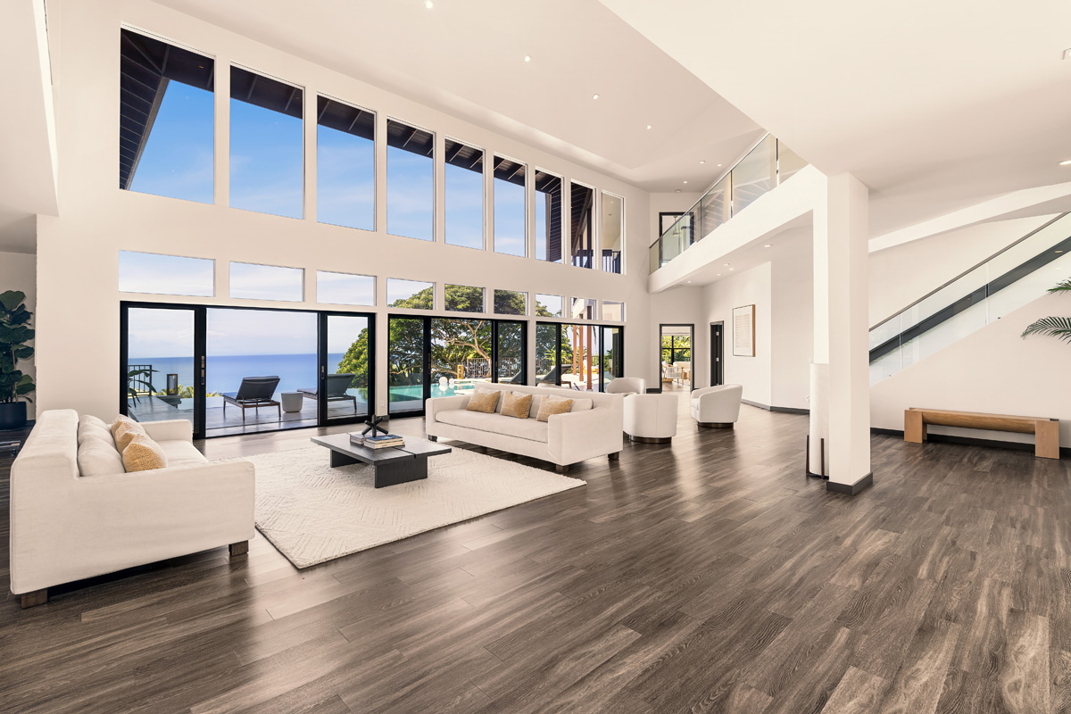 The living, dining, & kitchen areas flow seamlessly together & extend effortlessly to the expansive lānai and pool deck. The infinity-edge saltwater pool appears to spill into the Pacific, while multiple lounging, dining, & seating areas invite memorable gatherings.