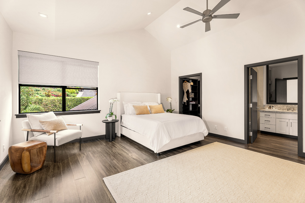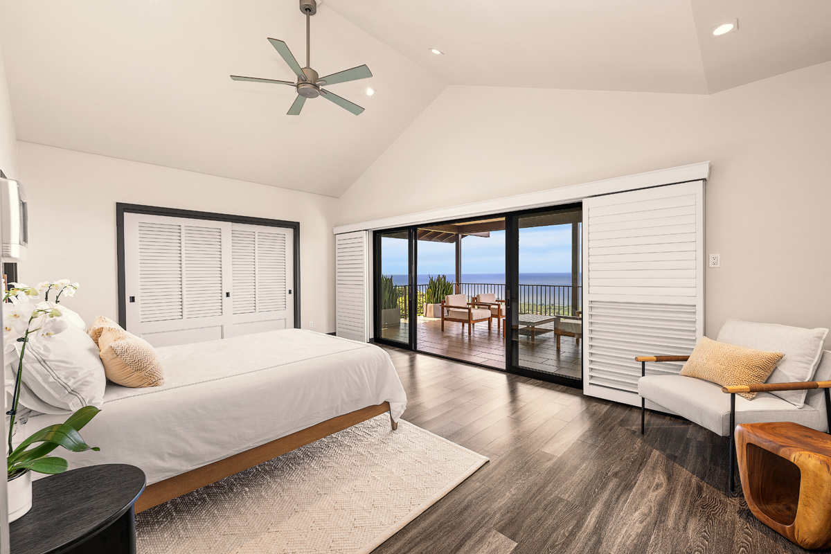 4 spacious ensuite bedrooms offer privacy, comfort, & stunning views. The primary suite occupies an exclusive wing of the home, an ocean-view lanai, a generous dressing suite, & a spa-inspired bath with soaking tub & walk-in shower. A secondary suite features a private large lanai & is ideal for sunset viewing.