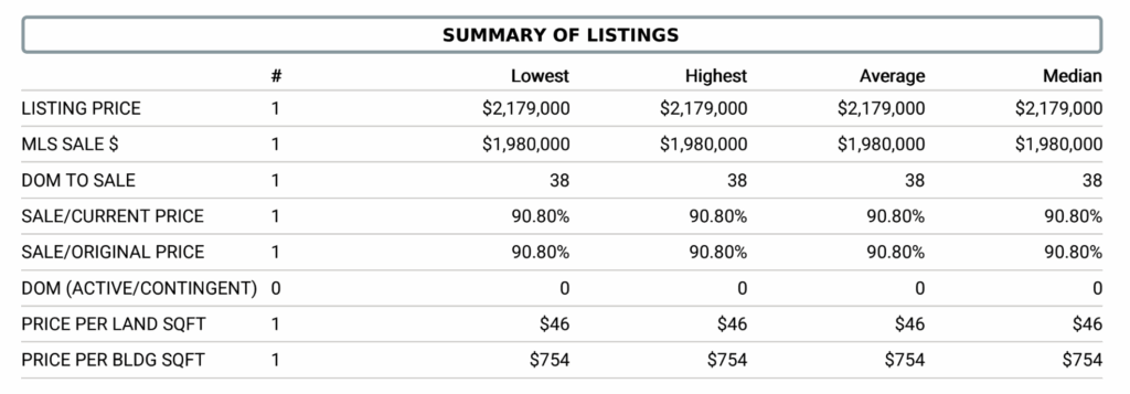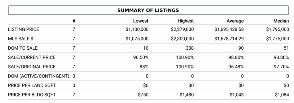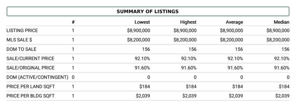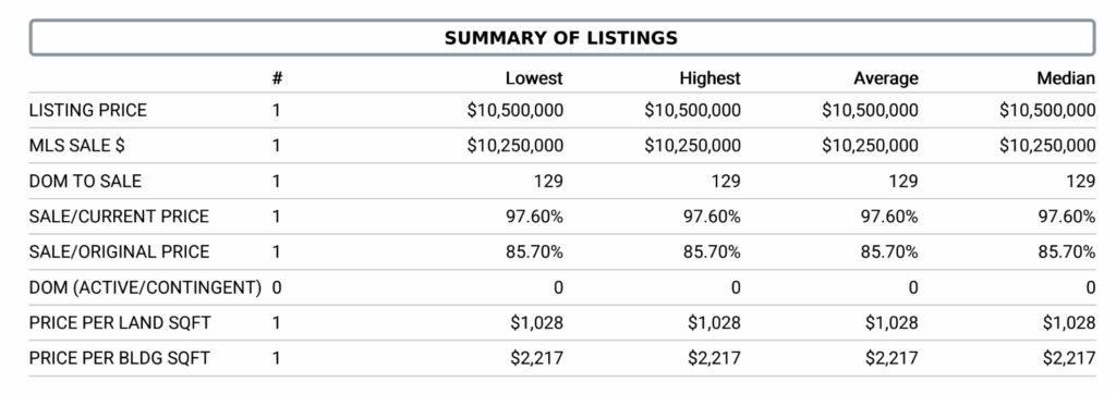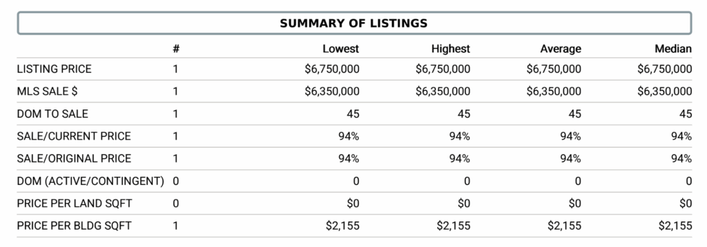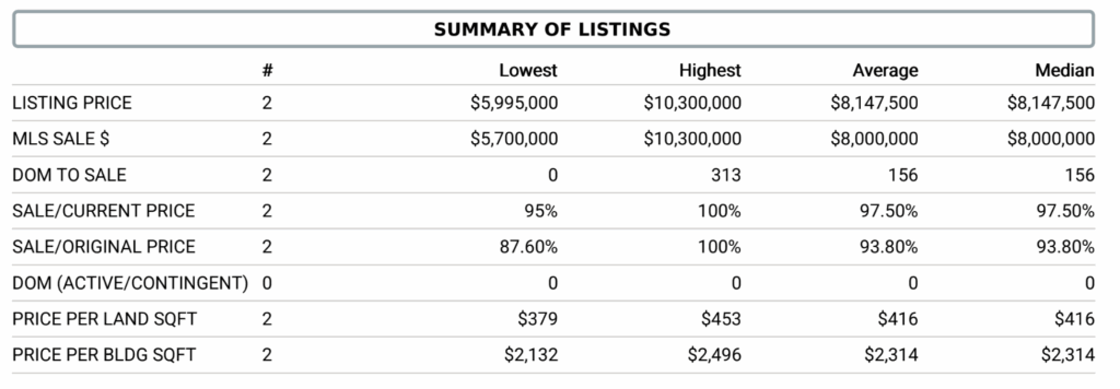 Condominium Sales – There were two condo sales in the month of September. With minimal days on the market, the units closed at $8.6M and $9.985M, averaging 97.85% of the Sale/Current Price. Average price per square foot was $2,871.