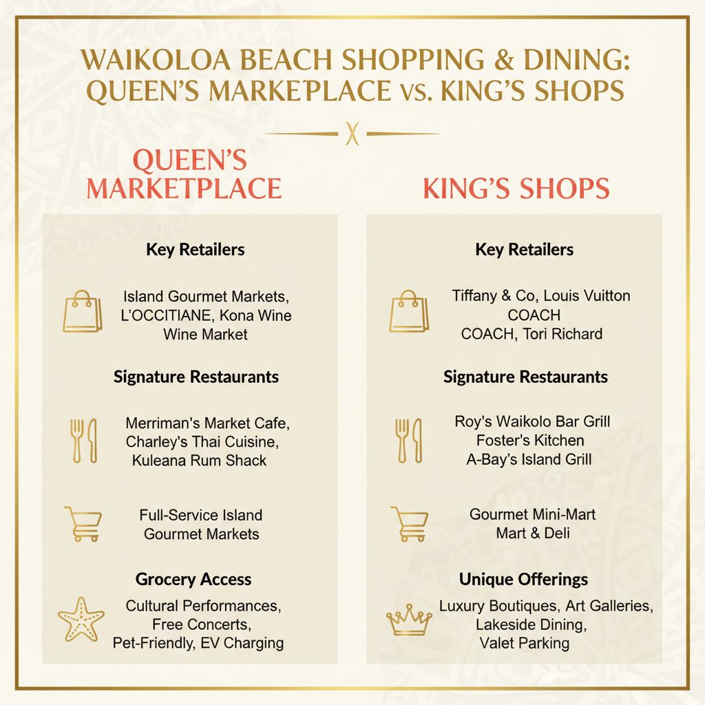 - Comprehensive Shopping & Dining: Waikoloa Beach is home to Queen’s Marketplace and King’s Shops, offering a wide array of retail, restaurants, and essential services.