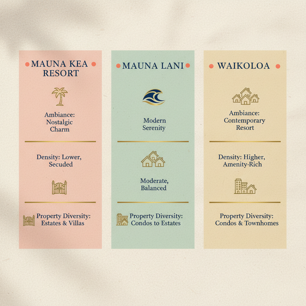 Quick answer: Mauna Kea Resort offers a distinct, nostalgic ambiance rooted in its Rockefeller-era origins, which has fostered strong loyalty among owners and repeat guests. Compared with generally newer developments at Mauna Lani and Waikoloa, Mauna Kea is lower density and offers a wider mix of property types, from condos to multi-million-dollar estates. The resort is also split by Queen Kaʻahumanu Highway (Queen K), creating a blend of oceanfront (makai) and upland (mauka) living.